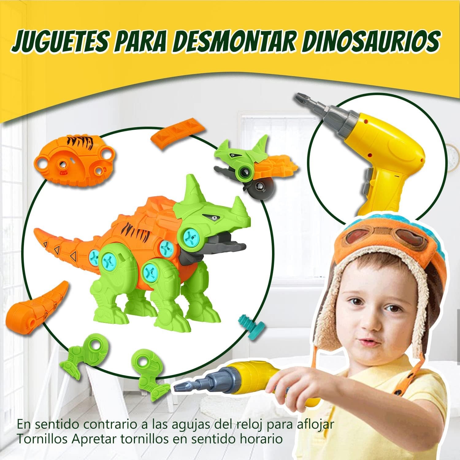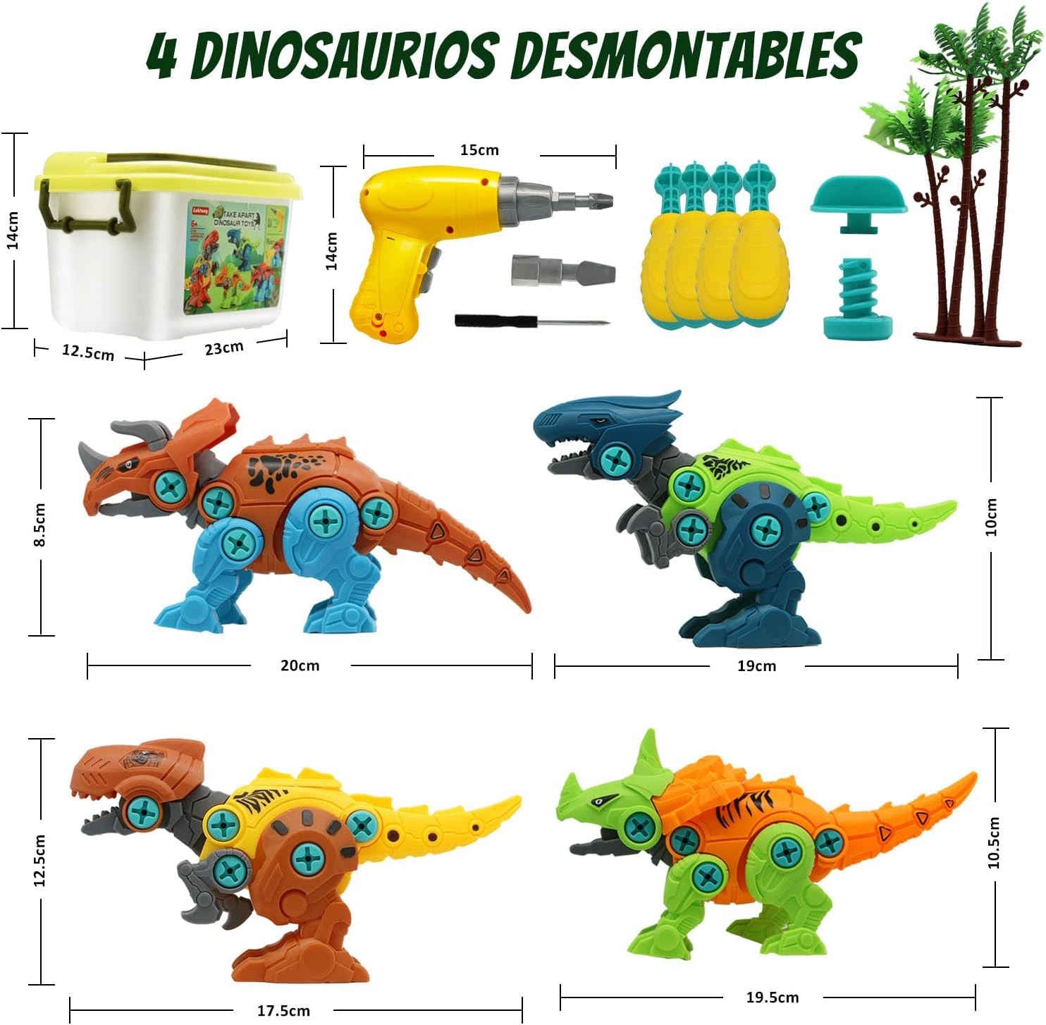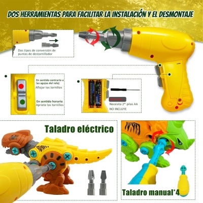 【Juguetes de dinosaurios】 El juego de juguetes de dinosaurios incluye cuatro dinosaurios: Triceratops, Tyrannosaurus Rex, Spikesaurus y Velociraptor, y también incluye 1 taladro eléctrico, 2 brocas diferentes, 1 destornillador manual, 1 caja de almacenamiento y 1 instrucciones de uso, el taladro está alimentado. por 2 pilas AA, las pilas no están incluidas en el paquete.
