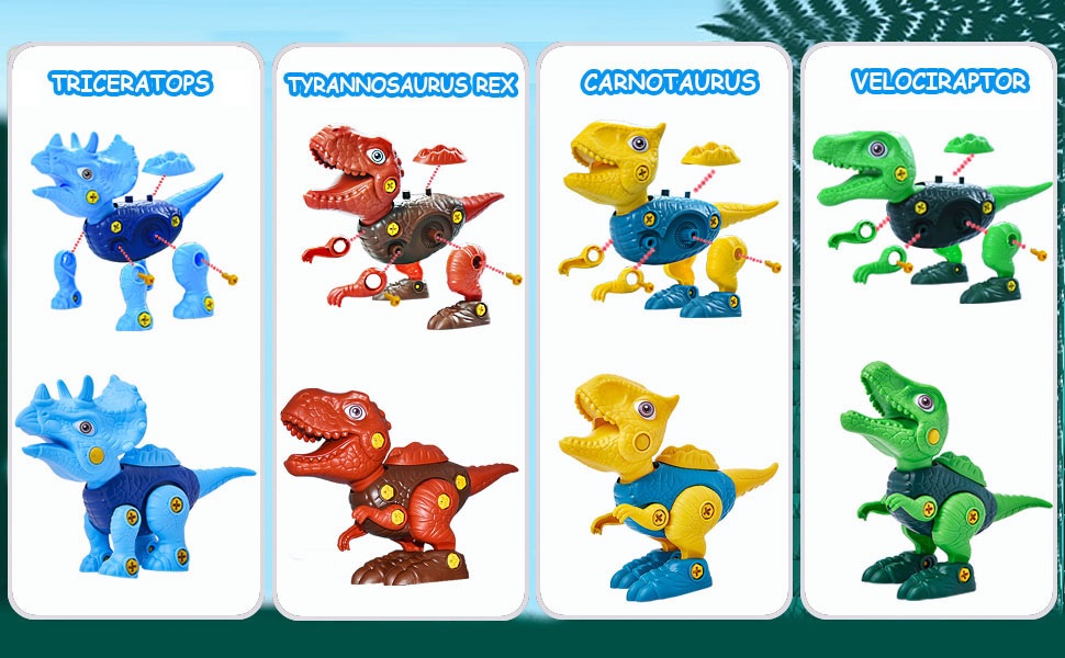 【100% Seguro y amigable】Los dinosaurios juguetes están hechos de plástico ABS reciclable no tóxico, que es duradero y resistente a las caídas y sin bordes afilados. Los bordes lisos son perfectos para que los agarren las manos pequeñas. Puede estar seguro de que este juguete desmontable es seguro para su pequeño.