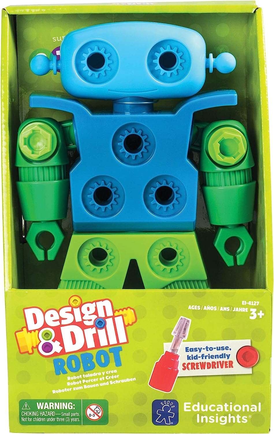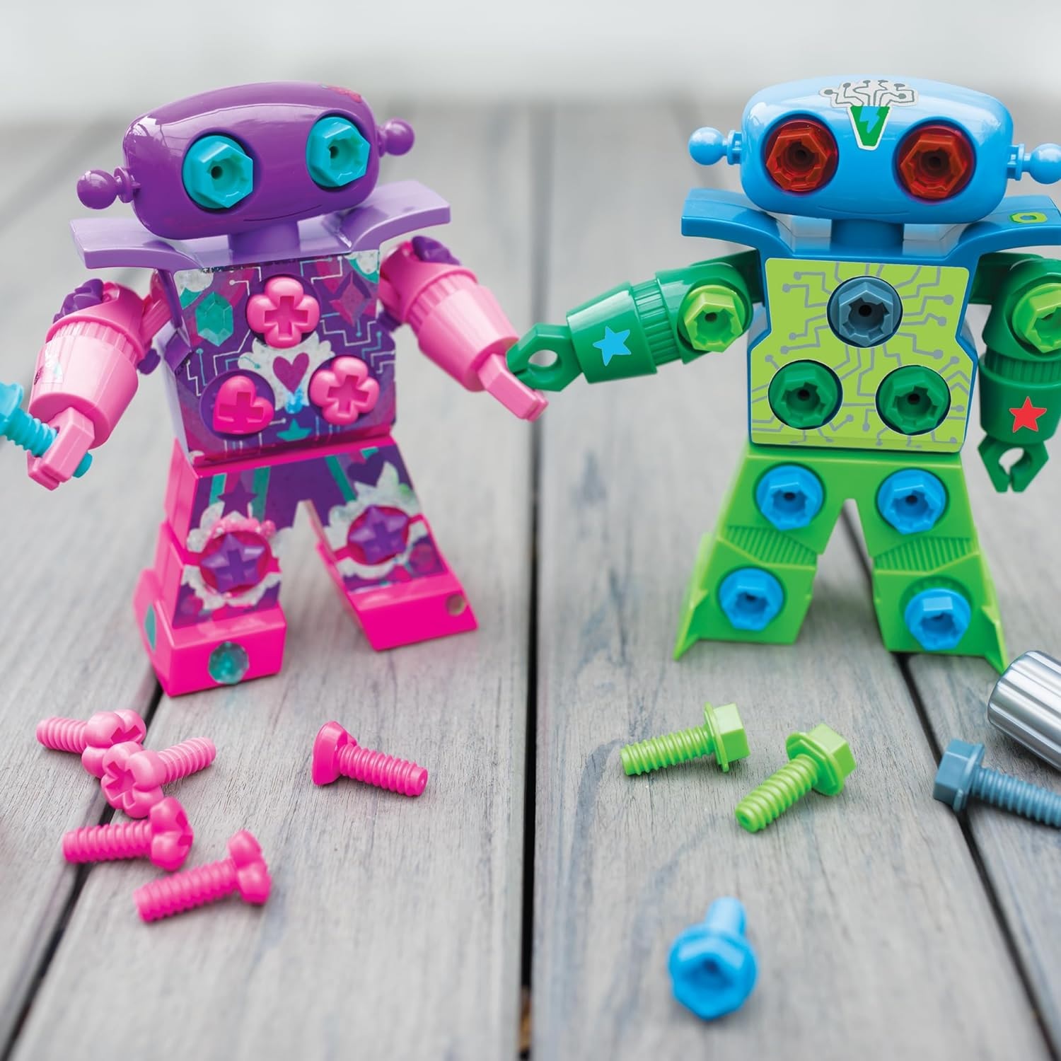 Los niños del preescolar pueden unir los brazos del robot y luego practicar la perforación de pernos multicolores con el destornillador para niños
