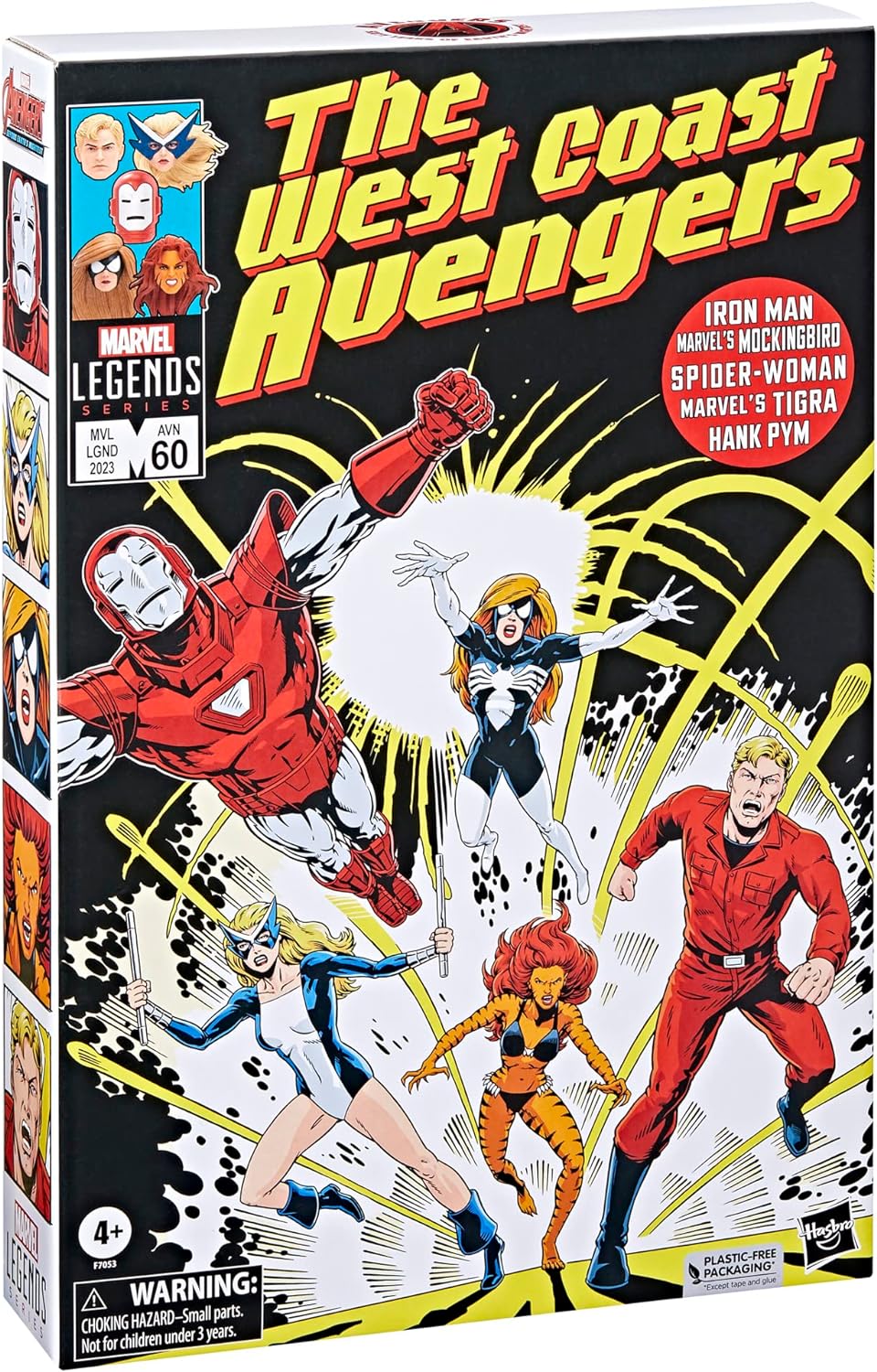 Este pack de 5 figuras de acción, inspiradas en The West Coast Avengers de los cómics de Marvel, incluye a Iron Man, Marvel's Mockingbird, Marvel's Tigra, Spider-Woman y Hank Pym.